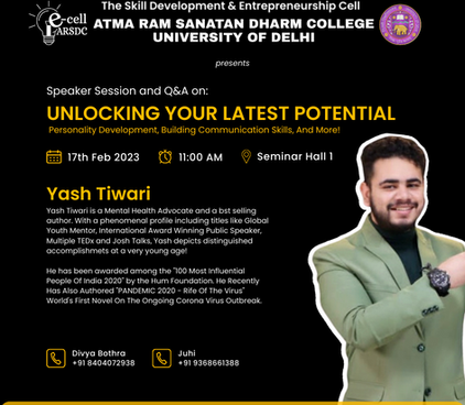 Yash has recently authored “Blisters Of The Battle" novella, topping the Amazon Bestseller Chart in Multiple Categories. Yash Tiwari's Debut Feature Film titled “THE THREE HUES", a movie aiming for motivating the global youth, has been an Official Selection and award winner and various film fests such as Santa Dev International Film Fest (Tamil Nadu), Caravan International Film Festival (Kolkata). He has delivered thought provoking sessions virtually for audiences all around the world, some of which were for the attendees in regions like the U.S., U.K., Philippines, Nigeria, Canada, Ghana, etc. He delivered a Talk at the United Nation 75th Anniversary International Youth Day Celebration (2020) organized virtually by the UN Volunteers from various nations. As a Personality Development Coach and Skill-Building Mentor, his is frequently delivers workshops on diverse sociological and psychological subject-matters.